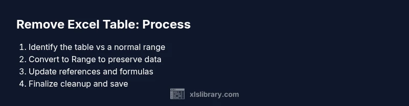 You're about to remove a stubborn Excel table and revert to a clean, unformatted range. This guide shows how to remove excel table safely, preserving data and layout. It covers converting to range, deleting only the structure, and updating dependent formulas. According to XLS Library, the safest path is to convert to a normal range first, then apply cleanup steps and save a backup before proceeding.